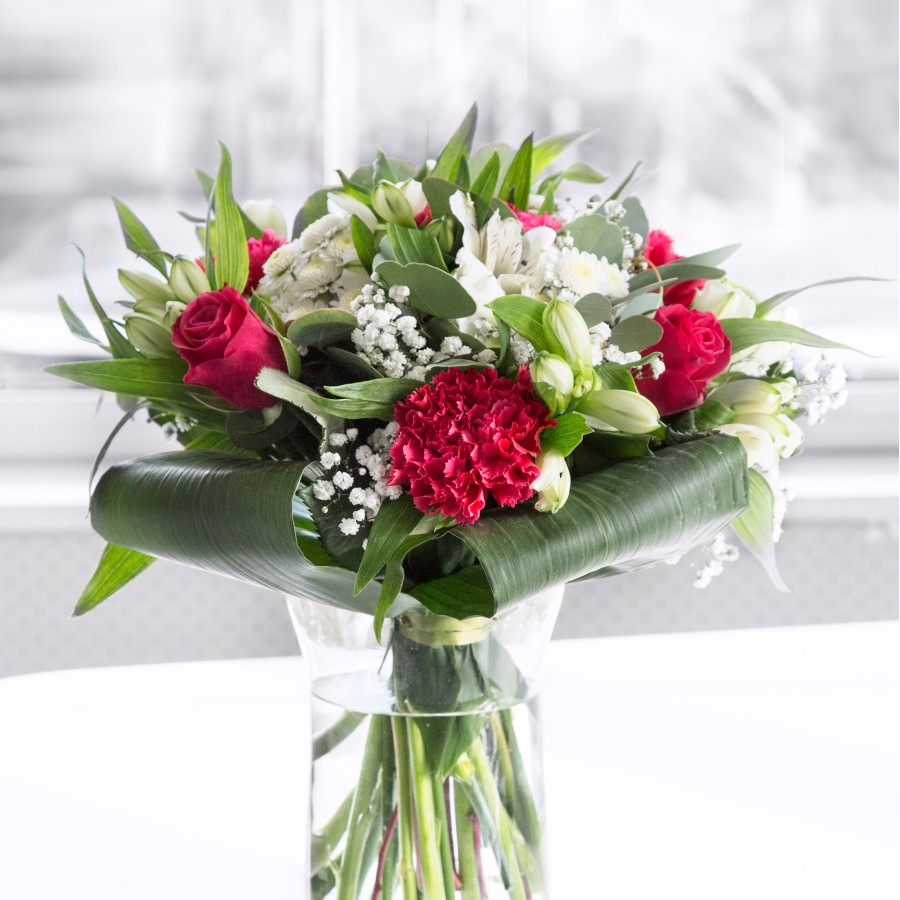 Express your love with our Classic Romance Bouquet. This beautiful arrangement features sweet white chrysanthemums and gypsophila alongside luxurious red roses and carnations, elegantly combined with white alstroemeria and vibrant aspidistra leaves.